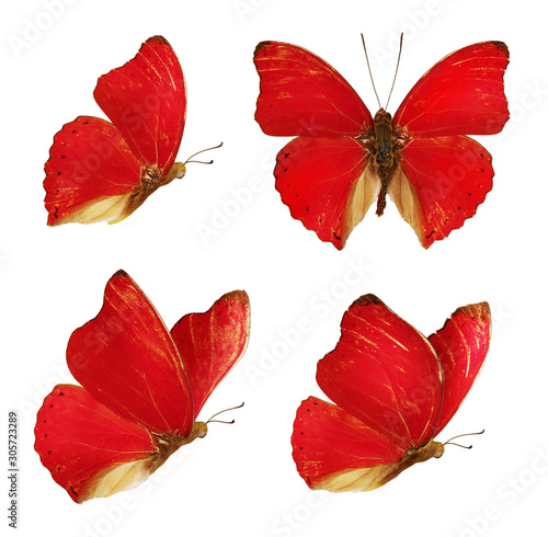 Set Of Four Beautiful Red Butterflies Cymothoe Excelsa Isolated On White Background Butterfly Nymphalidae With Spread Wings And In Flight Wall Mural Tatyana Sidyukova
